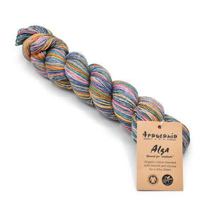 Araucania Alga means Sea Plants in Spanish. This 100% vegan yarn from sustainable sources is made in an environmentally safe way. This summer weight yarn is soft and drapey with a gentle striping repeat in color ranges that go from soft to vibrant. Alga is a delight for your summertime knitting and crocheting.