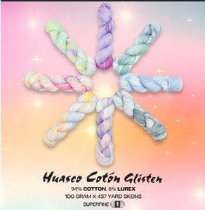 Huasco Coton: Glisten by Araucania Yarns, captures the elegant shimmer of a twinkling star. This hand-painted yarn embodies the delicate hues of the morning sky with a sparkle all its own. Bright, saturated waves of color with a touch of Glitz for added cheer. Perfect for creating socks and lightweight garments, this yarn offers a delicate take on the serene landscape, while offering a soft and smooth texture that glides effortlessly through your fingers. Let your next project capture the twinkle of the stars & the shine of a new day.